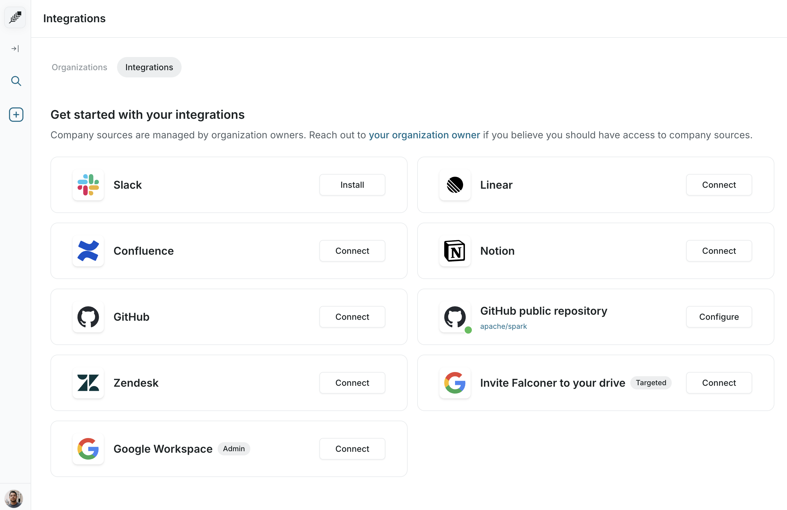 - Personal connection — Connect your individual Google account. Falconer can access docs you’ve created or opened.