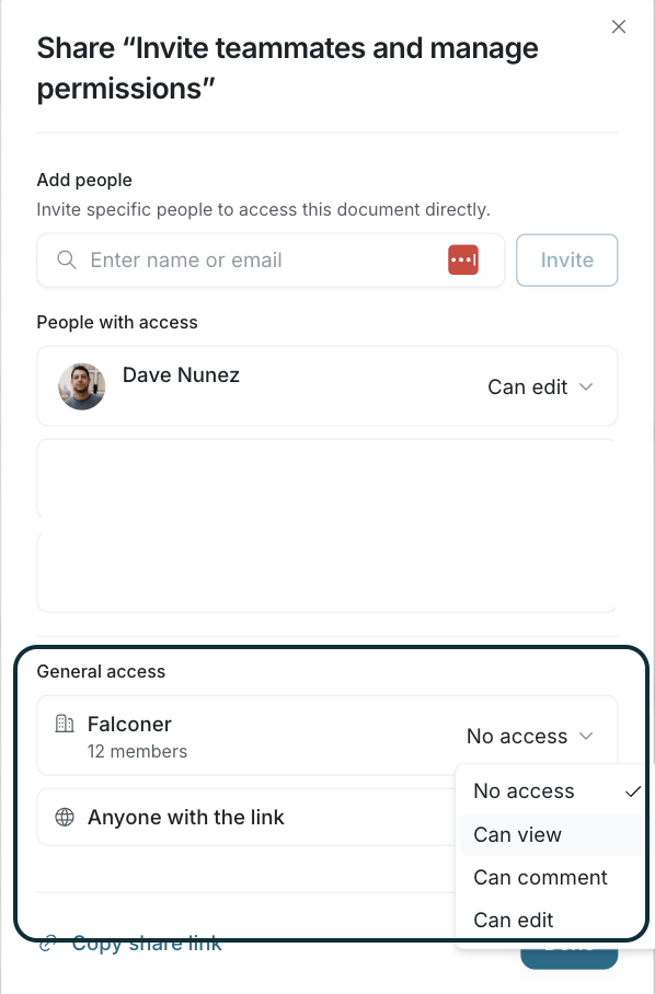 Note: Sharing org-wide grants access but doesn’t move the document to Company documents. Teammates can open it if they have the link, but it won’t appear in Falcon’s search results or Q&A answers. To make a document discoverable, publish it instead.