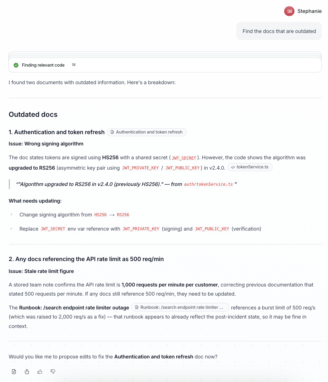 Section titled “From inside a doc”When you’re working in a document and want to know if it’s still accurate, ask the agent directly in the editor: