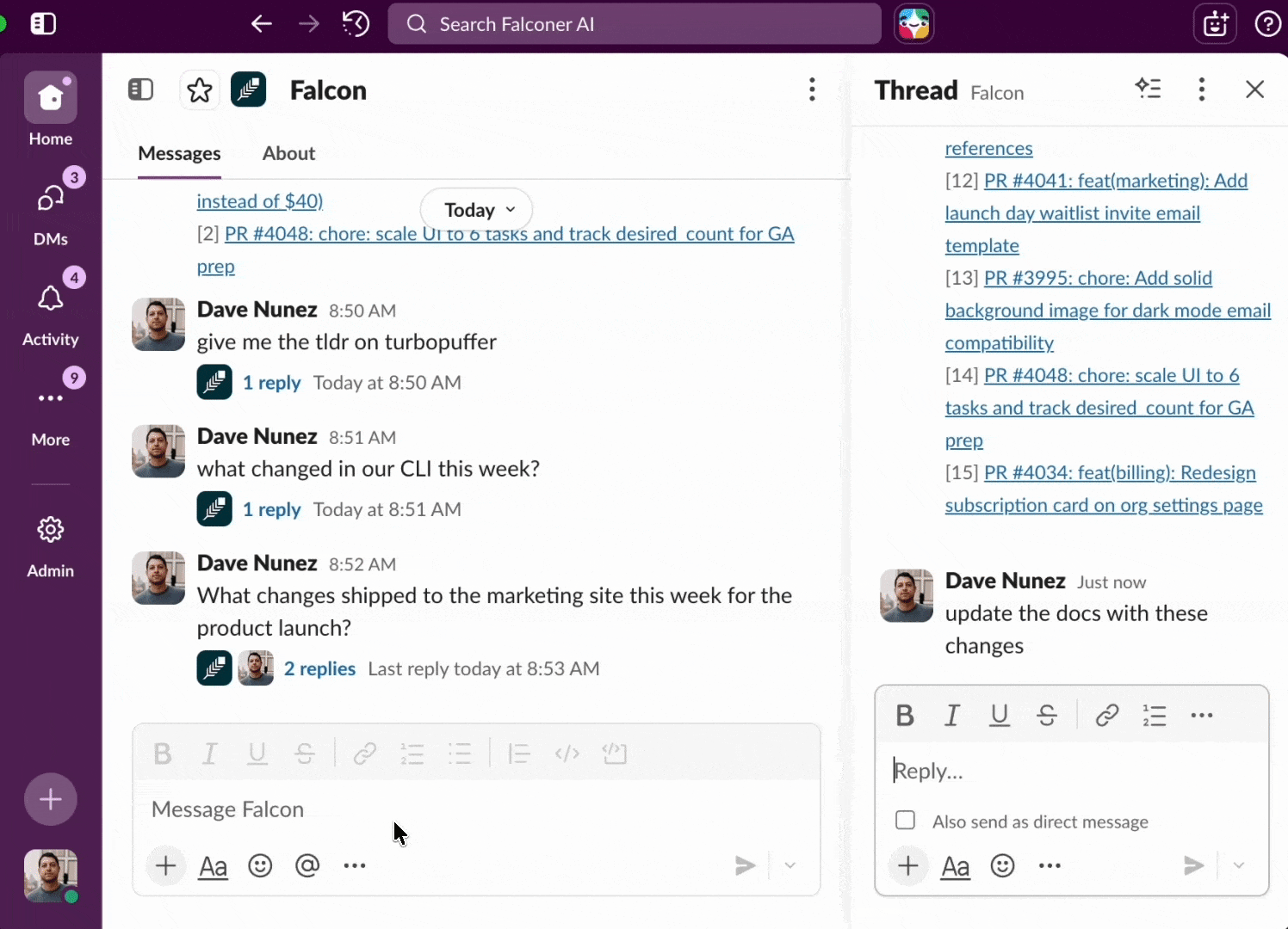 • Use threads. Falcon reads the full thread context, so reply in a thread where the relevant discussion happened.