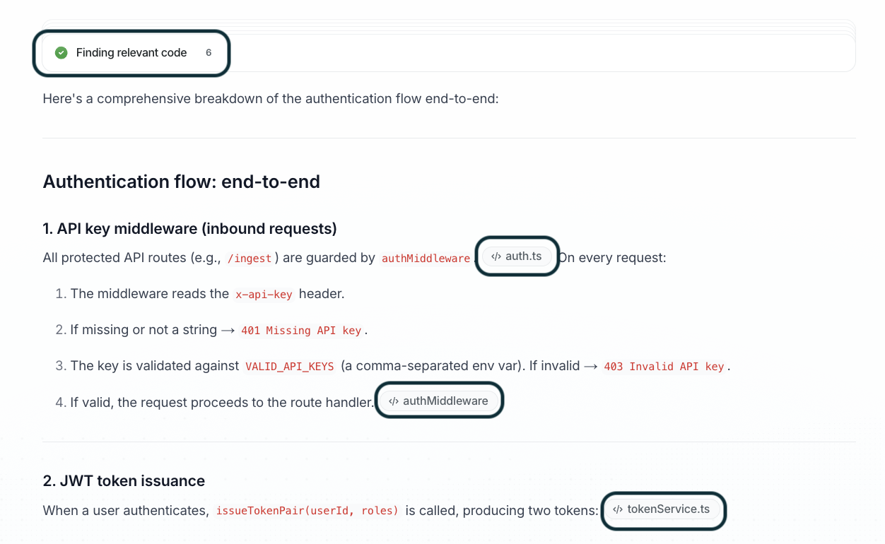 Falconer searches across your connected repositories, synthesizes an explanation, and cites the specific files and functions it drew from.